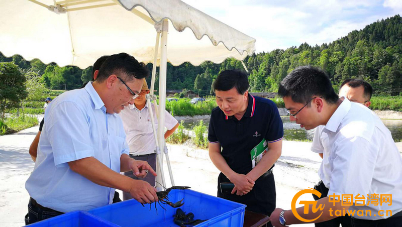 袁明副主任詳細(xì)了解川臺(tái)緣公司澳洲小龍蝦養(yǎng)殖情況(圖片來源:四川省臺(tái)辦)