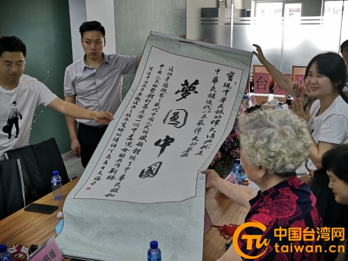 煙臺社區(qū)居民張作信展示了《夢回中國》書法(圖片來源:山東煙臺市臺港澳辦)