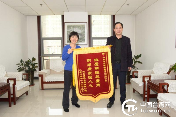 臺(tái)商吳易達(dá)向省委臺(tái)辦臺(tái)胞服務(wù)中心主任蘇雪茹贈(zèng)送錦旗。(河北省委臺(tái)辦供圖)