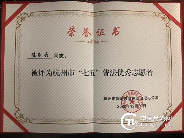 陳嗣云被評為杭州市“七五”普法優(yōu)秀志愿者。(圖片來源:杭州市臺辦供圖)