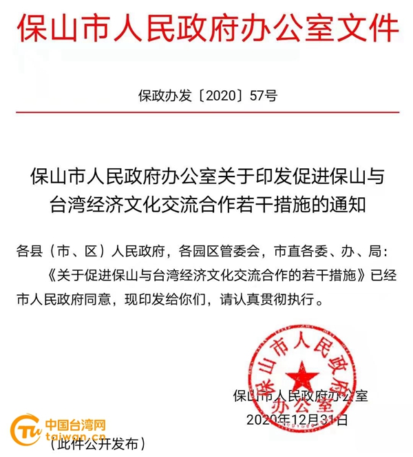 《保山市人民政府辦公室關(guān)于印發(fā)促進(jìn)保山與臺(tái)灣經(jīng)濟(jì)文化交流合作若干措施的通知》。(圖片來源:云南省保山市臺(tái)辦供圖)