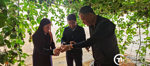蘇林(中)、胡小麗(左)、王九全(右)參觀百香果種植大棚。(圖片來(lái)源廣西崇左市臺(tái)辦供圖)