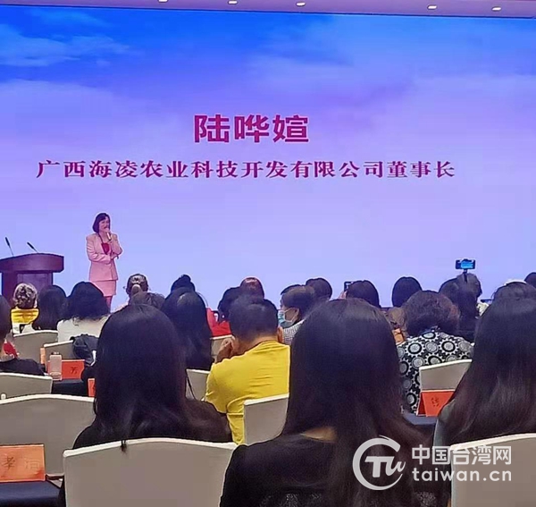 2020年10月31日,陸嘩媗在第九屆海峽兩岸婚姻家庭論壇的會場上分享自己的創(chuàng)業(yè)故事。(圖片來源:廣西臺辦)