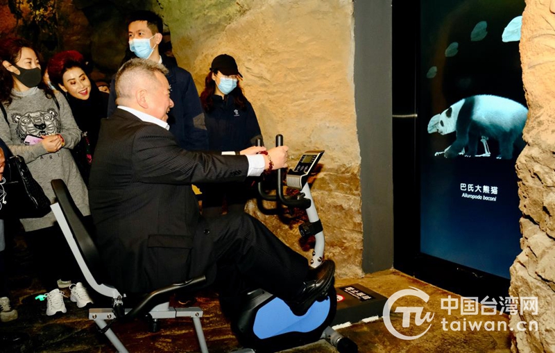 成都臺(tái)協(xié)會(huì)會(huì)長(zhǎng)高錦樂體驗(yàn)踩腳踏車看熊貓演變史。(圖片來源:四川省臺(tái)辦)