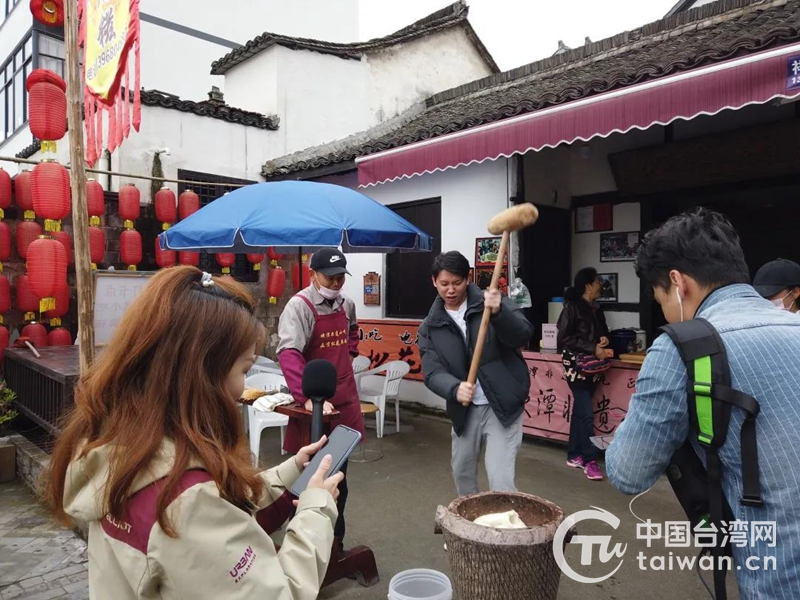 嘉賓現(xiàn)場體驗打麻糍(圖片來源:杭州市臺辦)