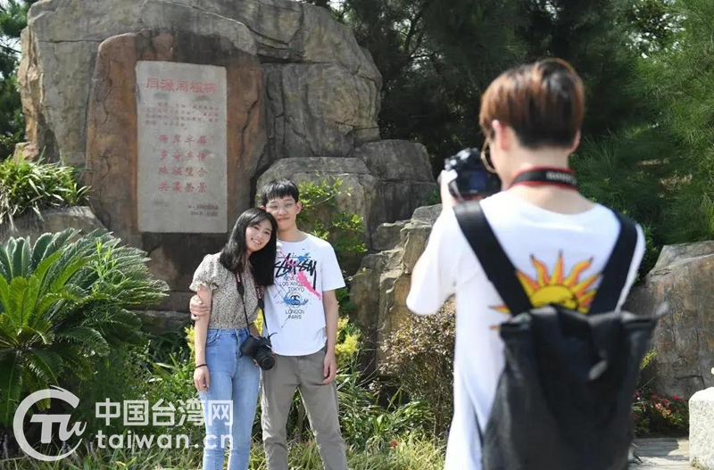 一對(duì)臺(tái)灣情侶在洞頭半屏山以同源同根碑為背景合影(圖片來(lái)源:浙江省臺(tái)辦)