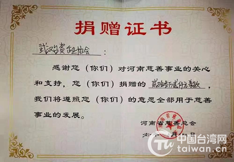 捐款證書(圖片來源:武漢市臺辦)