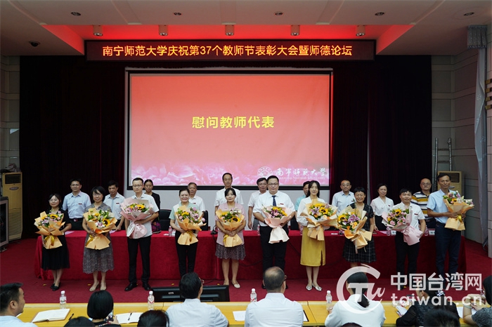 中國臺灣網(wǎng)9月14日訊 在第37個教師節(jié)之際,廣西南寧師范大學(xué)舉辦慶祝教師節(jié)表彰大會暨師德論壇,該校臺籍教師梁洲輔作為教師代表上臺接授鮮花與致意。他說:“在祖國當(dāng)人民教師是多么光榮自豪的一件事,讓我們一起努力為祖國添磚加瓦!