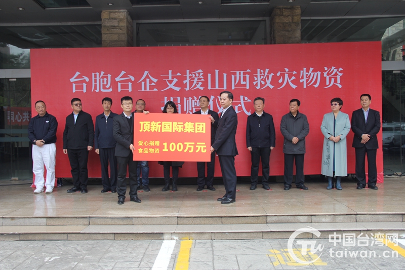 受強(qiáng)降雨影響,山西局部地區(qū)近日遭受嚴(yán)重雨澇災(zāi)害,多地出現(xiàn)洪水、內(nèi)澇和地質(zhì)災(zāi)害。災(zāi)情發(fā)生后,廣大臺(tái)商臺(tái)胞情系山西,紛紛通過(guò)多種方式表達(dá)對(duì)受災(zāi)同胞的關(guān)切和支持。在當(dāng)天的捐贈(zèng)活動(dòng)中,頂新國(guó)際集團(tuán)捐贈(zèng)100萬(wàn)元食品物資,旺旺集團(tuán)捐贈(zèng)100萬(wàn)元食品物資,慈濟(jì)慈善事業(yè)基金會(huì)捐贈(zèng)首批50萬(wàn)元物資,太原市臺(tái)企協(xié)21名臺(tái)商捐款6.8萬(wàn)元,臺(tái)灣中華兩岸婚姻家庭交流協(xié)會(huì)30名臺(tái)胞捐款6800元,海峽兩岸婚姻家庭協(xié)會(huì)24名臺(tái)胞捐款1.28萬(wàn)元。