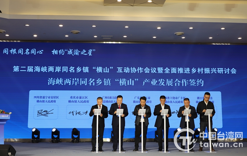 中國臺灣網(wǎng)10月28日訊 10月27日,以“同根同名同心·相約‘成渝之星’”為主題的第二屆海峽兩岸同名鄉(xiāng)鎮(zhèn)“橫山”互動協(xié)作會議暨全面推進(jìn)鄉(xiāng)村振興研討會在四川遂寧舉行。臺灣新竹縣橫山鄉(xiāng)(視頻)、重慶市綦江區(qū)橫山鎮(zhèn)等8個橫山鄉(xiāng)鎮(zhèn)(街道)、鄉(xiāng)村振興專家、全國臺聯(lián)兩岸經(jīng)貿(mào)交流及青年工作委員會及臺商代表共約160余名嘉賓參加會議。