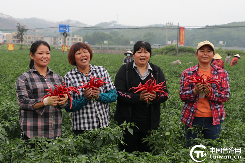 村民喜氣洋洋地展示剛剛采摘的辣椒。(中國臺灣網(wǎng)發(fā))