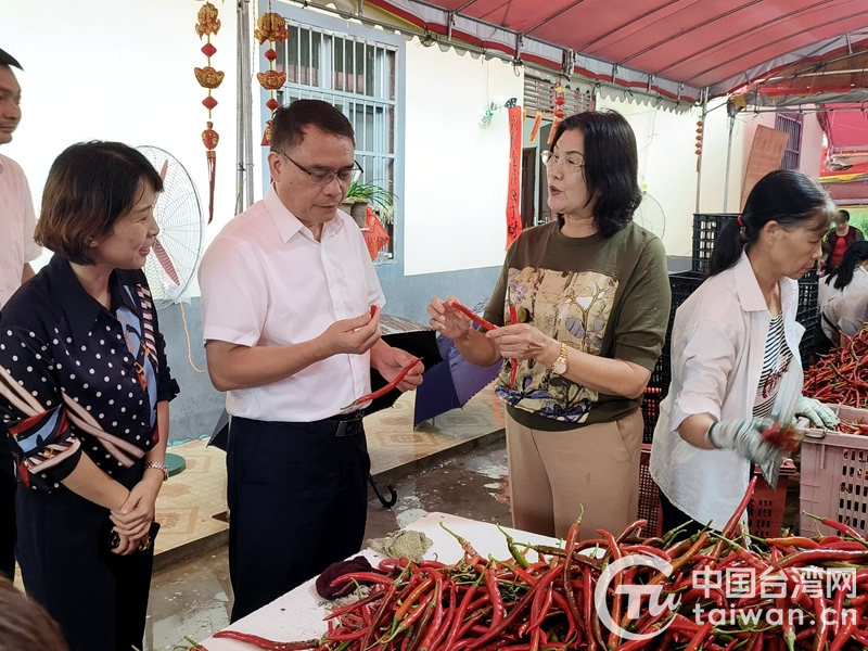 林承格(左二)在合浦兩岸紅鄉(xiāng)村振興合作基地項(xiàng)目查看采收的辣椒(圖片來(lái)源:北海市臺(tái)辦)