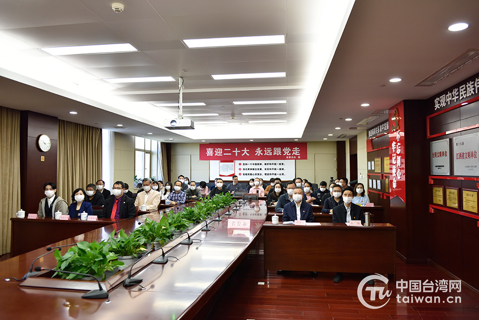 10月16日,江西省委臺(tái)辦組織臺(tái)辦干部及部分在贛臺(tái)商臺(tái)生臺(tái)屬代表集中收聽收看習(xí)近平在中國共產(chǎn)黨第二十次全國代表大會(huì)上的報(bào)告,深入學(xué)習(xí)領(lǐng)會(huì)大會(huì)精神。(中國臺(tái)灣網(wǎng) 發(fā))