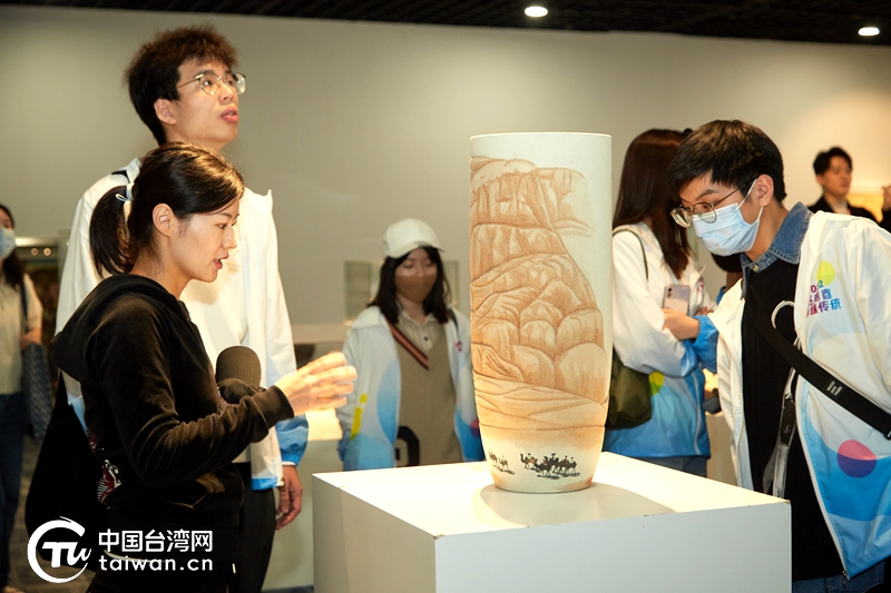 白亦佼老師(左一)為兩岸青年講述參展藝術(shù)品的創(chuàng)作過(guò)程和創(chuàng)作歷史(中國(guó)臺(tái)灣網(wǎng) 發(fā))