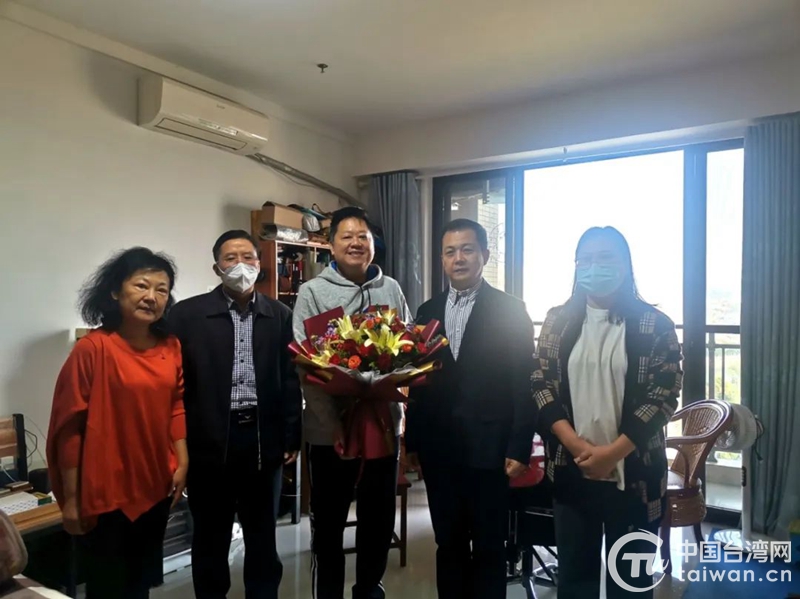 百色市委常委閆炳辰(右二)慰問(wèn)臺(tái)灣教師章國(guó)威(中)(圖片來(lái)源:百色市臺(tái)辦)