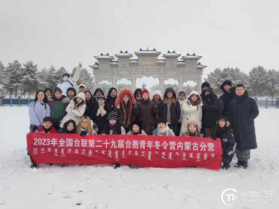 營(yíng)員們?cè)趦?nèi)蒙古自治區(qū)首個(gè)獲批的國(guó)家級(jí)海峽兩岸交流基地——成吉思汗陵外合影。(中國(guó)臺(tái)灣網(wǎng) 高嘉鴻 攝)