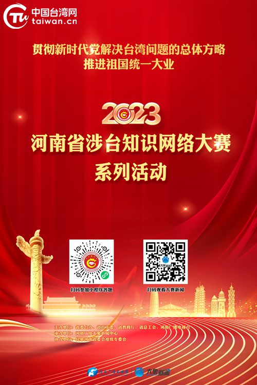 中國臺灣網3月27日訊 為進一步深入學習宣傳貫徹黨的二十大精神,扎實推進涉臺宣傳教育工作,由河南省委臺辦、省直工委、省教育廳、省總工會、河南廣播電視臺聯(lián)合主辦,河南廣電大象新聞中心承辦,民革河南省委會祖統(tǒng)專委會協(xié)辦的“貫徹新時代黨解決臺灣問題的總體方略,推進祖國統(tǒng)一大業(yè)”2023年河南省涉臺知識網絡大賽將于3月28日正式啟動。