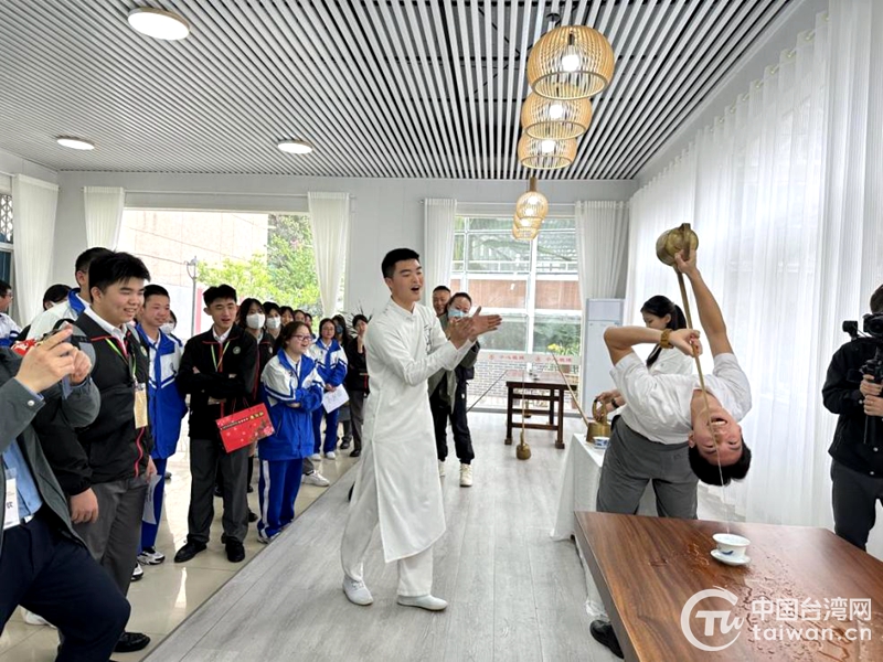 東莞臺商子弟學(xué)校學(xué)生在川大附中參觀了獨(dú)具特色的防空洞“勞動教室”。防空洞里,隔出了整整齊齊的十來間教室:食用菌栽培室、自制腐乳皮蛋儲藏室、自制酒儲藏室、自制泡菜儲藏室……學(xué)生們可以根據(jù)個人興趣,選擇相應(yīng)課程進(jìn)行創(chuàng)造性勞動體驗(yàn),完成了物化成果的制作:釀酒、做醪糟、自制皮蛋、種植蘑菇、泡菜等等。戰(zhàn)時遺址變成豐富多彩的實(shí)驗(yàn)教室,讓學(xué)生們驚訝不止。在學(xué)校勞動教育基地,川臺結(jié)對的小伙伴們一起體驗(yàn)了蔬菜種植的樂趣,觀賞了極具四川特色的茶藝表演,感受精彩獨(dú)特的巴蜀文化,東莞學(xué)生們還大膽嘗試了一把花式倒茶,兩岸年輕人的青春活力與中華傳統(tǒng)才藝的碰撞,現(xiàn)場其樂融融,一片歡聲笑語。