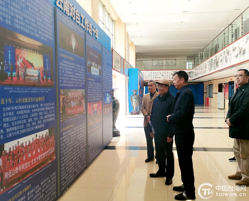 張燦(右二)陪同李慈雄董事長(zhǎng)(左二)參觀《云南對(duì)臺(tái)工作這十年展》(圖片來(lái)源:云南省臺(tái)辦)