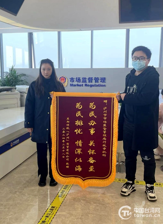 中國(guó)臺(tái)灣網(wǎng)2月29日訊 近日,臺(tái)資企業(yè)莫斯領(lǐng)航(瀘州)商貿(mào)有限公司負(fù)責(zé)人將一面印有“為民辦事 關(guān)懷備至 為民排憂 深情似海”字樣的錦旗送至四川瀘州市市場(chǎng)監(jiān)督管理局行政審批科商事登記港澳臺(tái)投資專窗,衷心感謝窗口同志的熱情幫助和悉心指導(dǎo)。