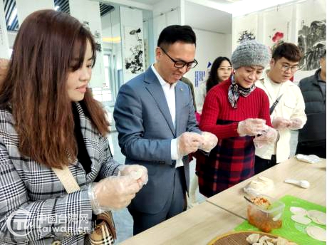 游智彬一行與社區(qū)工作者一起包餃子(濟(jì)南市臺(tái)辦供圖)