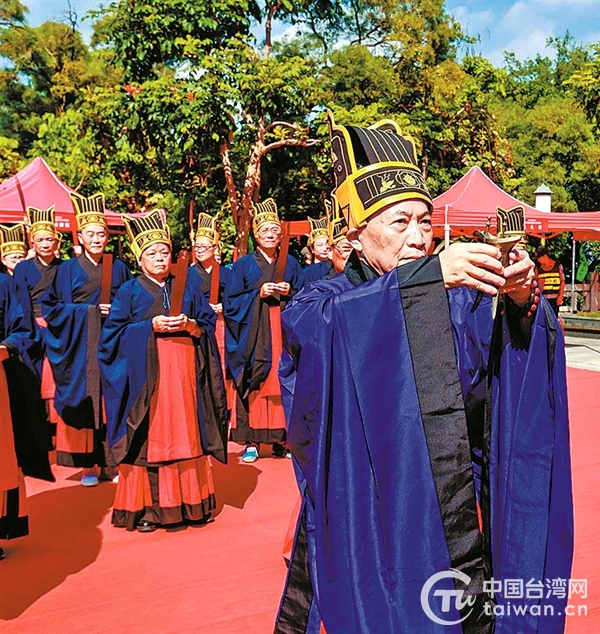 鼓初嚴(yán)、鼓再嚴(yán)、鼓三嚴(yán)。伴隨著雄渾深沉的鼓聲響起,主祭官浴手、迎神、宣讀祭文,帶領(lǐng)兩岸民眾代表莊重地進(jìn)行三獻(xiàn)禮等流程,完成了一場(chǎng)莊嚴(yán)肅穆的尊古頌典儀式。