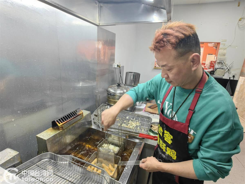 位于江漢區(qū)北湖正街的“臺客鹽酥雞”店內(nèi),潘佳輝正在專心制作炸品。(中國臺灣網(wǎng)發(fā))