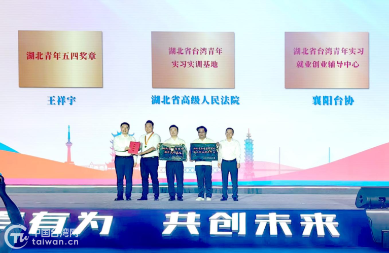 現(xiàn)場舉行頒授儀式,為王祥宇頒授“湖北省五四青年獎(jiǎng)?wù)隆,為湖北省高級人民法院及襄陽臺協(xié)分別頒授“湖北省臺灣青年實(shí)習(xí)實(shí)訓(xùn)基地”“湖北省臺灣青年實(shí)習(xí)就業(yè)輔導(dǎo)中心”牌匾。