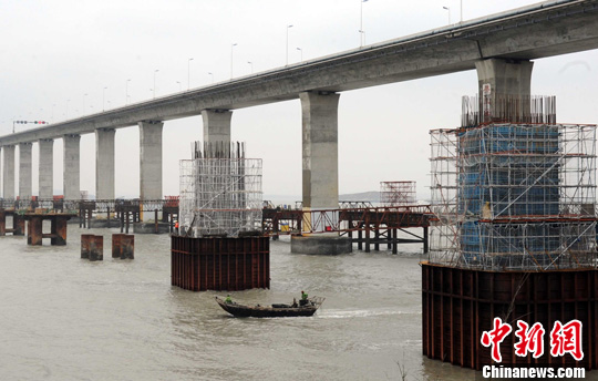 歲末,概算總投資15億元人民幣的福建平潭海峽大橋復(fù)橋由水下樁基施工轉(zhuǎn)入墩身施工階段。中新社記者 劉可耕 攝