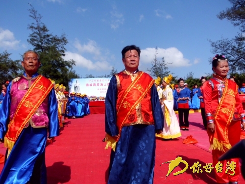 14點(diǎn)18分,象征財(cái)如水漲的海水開(kāi)始漲潮,青浦底海灘上擂鼓三通,海螺長(zhǎng)鳴,禮炮九響恭請(qǐng)媽祖金身安座,海祭儀式正式開(kāi)始。湄洲媽祖祖廟董事會(huì)董事長(zhǎng)林金榜等三位主祭人率兩岸信眾,面朝大海,向媽祖神像行三跪九叩大禮。