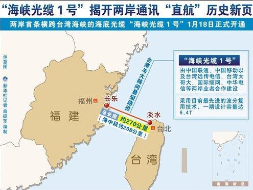 中國聯(lián)通福州海峽兩岸通信業(yè)務出入口近日已正式竣工。中國聯(lián)通福建省分公司18日對此表示,今后可利用福州長樂至臺灣淡水的“海峽光纜1號”(TSE-1海纜)等連接臺灣地區(qū),改變電路迂回繞接的現(xiàn)狀,真正意義上實現(xiàn)對臺的直達通信。