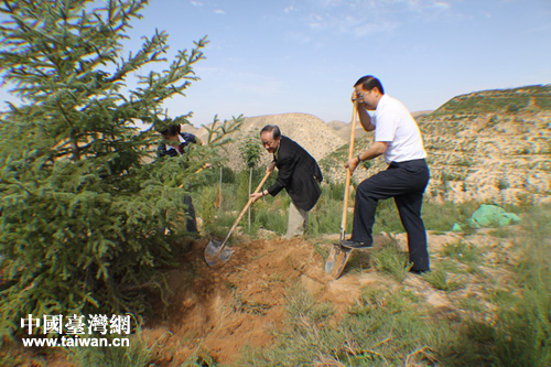 臺(tái)灣新黨主席郁慕明親手栽種隴臺(tái)親情樹(shù)。(圖片來(lái)源:甘肅省臺(tái)辦)