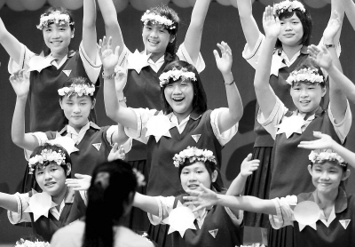 7月19日,“2010滬臺(tái)青少年走進(jìn)世博”千人夏令營(yíng)在上海東方藝術(shù)中心舉行開營(yíng)式暨文藝演出。來(lái)自滬臺(tái)兩地各16所中學(xué)的1600余名師生將在夏令營(yíng)期間參觀上海世博會(huì),并舉行系列豐富多彩的活動(dòng)以加深了解,共享世博。圖為臺(tái)灣嘉義宏仁女中的學(xué)生在表演合唱節(jié)目。新華社記者 劉穎攝
