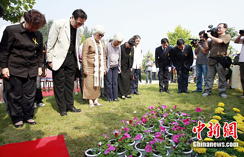 柏楊夫人張香華(左三)、兒子郭本城(左二)、女兒郭素萍、崔渝生(左一)、外甥女楊克敏等親屬在柏楊墓前向柏楊告別。中新社記者 王中舉 攝