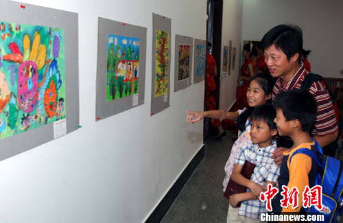 10月9日,來自臺灣的小朋友正在和老師一起看畫展。當(dāng)日,來自臺灣及福州的小朋友們在福州畫院舉辦“親情海峽 彩虹書畫――第二屆榕臺小學(xué)生書畫交流會”。兩岸小朋友都很高興以書畫為平臺,更好的交流。