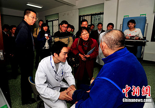 11月1日,受中共四川省委書(shū)記劉奇葆邀請(qǐng),臺(tái)灣南投縣浦里鎮(zhèn)長(zhǎng)青村村長(zhǎng)陳芳姿夫婦1日抵達(dá)成都,交流川臺(tái)兩地災(zāi)后重建的經(jīng)驗(yàn)。圖為陳芳姿和其丈夫王子華來(lái)到四川省肢體傷殘康復(fù)中心參訪,與殘肢人士交流接觸。中新社發(fā) 安源 攝