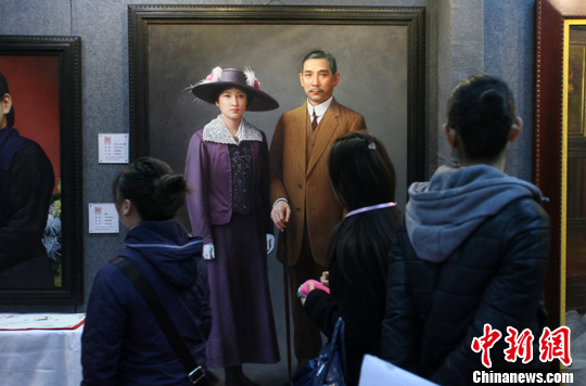 3月6日,北京一文化公司為紀(jì)念辛亥革命一百周年推出的孫中山與宋慶齡油畫像在北京一禮品展覽會(huì)上展出。據(jù)悉,這些畫像將贈(zèng)予北京宋慶齡故居。今年是辛亥革命一百周年,大陸商家也適時(shí)推出了各種辛亥革命紀(jì)念品。中新社發(fā) 蘇丹 攝