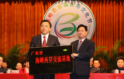 在22日廣東省蕉嶺縣舉行的首屆長壽文化節(jié)上,廣東省臺灣事務辦公室正式將“廣東省海峽兩岸交流基地”授予蕉嶺縣。據(jù)悉,這是首個由省級政府授予的海峽兩岸交流基地。海峽兩岸關系協(xié)會副會長張銘清及廣東省有關負責人出席了授牌儀式。
