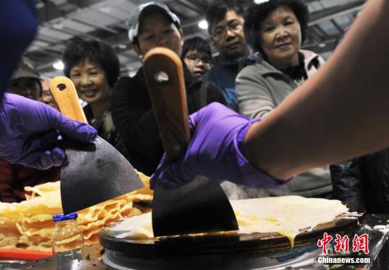 2月7日晚,北京地壇廟會的臺北之旅,借助臺北燈節(jié)今夜開幕良機在花博公園登場,傳統(tǒng)小吃煎餅果子格外吃香。賈國榮 攝