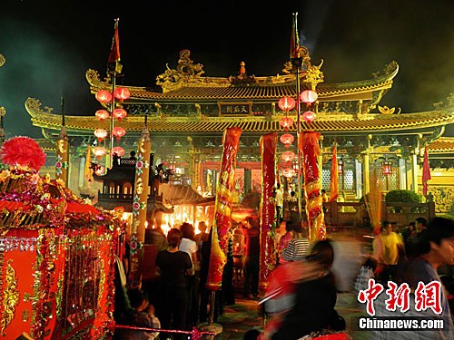 4月24日晚,廣東汕尾市城區(qū)中華媽祖文化節(jié)吸引了眾多潮汕地區(qū)、珠三角乃至港澳臺地區(qū)的香客前來朝拜媽祖。該活動從24日開始,持續(xù)兩天;顒映腊輯屪嫱,舉行一系列具有潮汕文化的傳統(tǒng)節(jié)目,如西秦戲、汕尾漁歌等表演,以及大潮汕地區(qū)燈謎活動等,為從海外、港澳臺歸來的“游子”展示出了家鄉(xiāng)新貌。中新社發(fā) 陳世勇 攝
