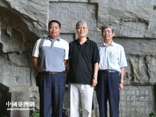 英德政協(xié)文史委林超富主任與兩位教授在碧落洞摩巖石刻前合影(圖片來源:英德市臺(tái)辦)