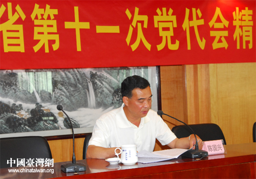 陳國興介紹了廣東省第十一次黨代會基本情況后,重點傳達學習了汪洋代表十屆省委向大會所作的報告和在省委十一屆一次全會上所作的重要講話。他指出,省臺辦一定結(jié)合當前對臺工作的形勢和任務,認真制定方案,進一步抓好會議精神的學習貫徹,把全體黨員、干部的思想認識切實統(tǒng)一到會議精神上來。