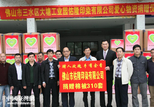 中國臺灣網12月25日佛山消息 日前,三水臺資企業(yè)——佛山市佑隆印染有限公司在三水區(qū)委社工部舉行簡單而隆重的慈善捐贈儀式,向三水區(qū)慈善會捐贈被褥310套,向三水區(qū)光彩事業(yè)促進會捐贈被褥110套,總價值合計約25多萬元。