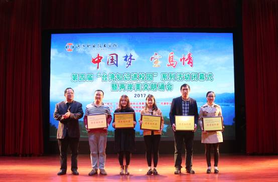 閉幕式上,市臺(tái)辦副主任李斌作了總結(jié)講話。他說(shuō),本屆“臺(tái)灣知識(shí)進(jìn)校園”系列活動(dòng)以“中國(guó)夢(mèng),寶島情”為主題,相繼開(kāi)展了“演講比賽、電影觀賞、知識(shí)競(jìng)賽、美文朗誦”等活動(dòng),覆蓋了全市五所大中專院校師生3萬(wàn)多人。整個(gè)活動(dòng)組織有力,特色突出,精彩紛呈,具有參與規(guī)模大、活動(dòng)形式活、宣傳內(nèi)容廣、教育效果好等顯著特點(diǎn),較好地吸引和引導(dǎo)了廣大青年學(xué)生關(guān)心兩岸關(guān)系的發(fā)展,積極投身兩岸交流合作活動(dòng),為祖國(guó)的和平統(tǒng)一事業(yè)作出新的貢獻(xiàn)。特別是河職院賴小景副校長(zhǎng)帶頭和帶領(lǐng)部分老師踴躍參加了兩岸美文朗誦會(huì)活動(dòng),對(duì)活動(dòng)的開(kāi)展給予了有力支持和促進(jìn)。他表示,要繼續(xù)努力,創(chuàng)新發(fā)展,把“臺(tái)灣知識(shí)進(jìn)校園”系列活動(dòng)打造成一個(gè)富有影響力的涉臺(tái)宣傳教育品牌。