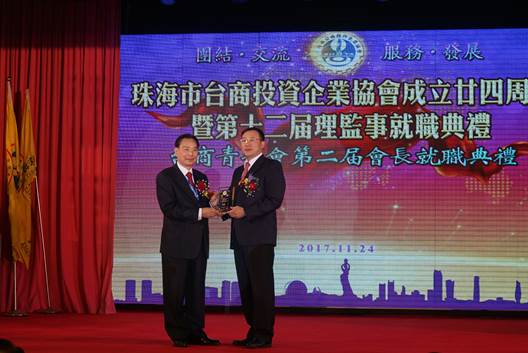 中國臺(tái)灣網(wǎng)11月30日珠海訊 珠海臺(tái)商投資企業(yè)協(xié)會(huì)2017年11月24日在珠海市度假村酒店舉行協(xié)會(huì)成立24周年慶典暨第12屆理監(jiān)事就職典禮,第十一屆會(huì)長葉飛呈連任新一屆會(huì)長;前海協(xié)會(huì)會(huì)長陳云林、前;鶗(huì)董事長江丙坤、澳門中聯(lián)辦臺(tái)務(wù)部部長徐莽、海協(xié)會(huì)駐澳辦主任楊流昌、廣東省臺(tái)辦副主任方濤、市委常委統(tǒng)戰(zhàn)部部長郭才武等領(lǐng)導(dǎo)和嘉賓近700人出席了慶典活動(dòng)。