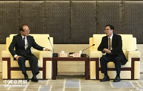 圖為東莞市委書記梁維東(右一)會(huì)見國民黨榮譽(yù)副主席林豐正(左一)現(xiàn)場(chǎng)。
