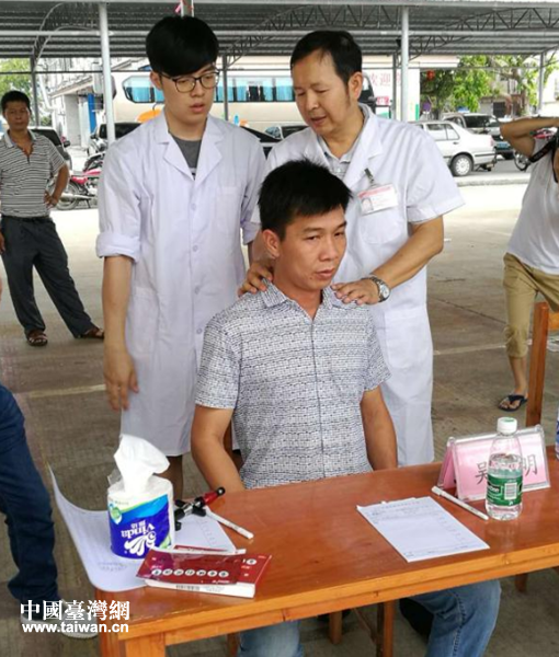 吳一鳴博士(廣州中醫(yī)藥大學(xué)培養(yǎng)的臺灣中醫(yī)學(xué)博士,擅長推拿按摩,脊柱康復(fù)及各類痛癥的治療)義診。(圖片來源:廣州市臺聯(lián))