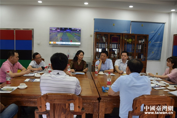 當(dāng)天上午,調(diào)研組一行來(lái)到新會(huì)區(qū)體育中心參觀,并實(shí)地考察了廣東珠超聯(lián)賽有限公司,與廣東珠超聯(lián)賽有限公司董事長(zhǎng)黃達(dá)昌及珠超臺(tái)灣球隊(duì)主教練張展維圍繞如何創(chuàng)建“廣東省海峽兩岸青少年交流基地”進(jìn)行了深入座談交流。劉小青表示,海峽兩岸交流基地適應(yīng)兩岸大開(kāi)放、大交流的新形勢(shì)要求,突出兩岸交流地方特色,是深化兩岸經(jīng)貿(mào)文化交流合作的新平臺(tái)。江臺(tái)兩地五人制足球領(lǐng)域交流已具備相當(dāng)基礎(chǔ),希望江門(mén)能把握資源優(yōu)勢(shì),利用珠超俱樂(lè)部平臺(tái),發(fā)揚(yáng)江臺(tái)兩地五人足球文化,共促兩地青少年交流合作,讓“兩岸一家親”理念深入人心。譚健文表示,非常感謝省臺(tái)辦對(duì)江門(mén)對(duì)臺(tái)工作的關(guān)心與支持,江門(mén)市臺(tái)辦將貫徹落實(shí)省臺(tái)辦工作要求,憑借珠超聯(lián)賽的實(shí)力基礎(chǔ),打造江臺(tái)兩地青少年交流平臺(tái),努力爭(zhēng)創(chuàng)“廣東省海峽兩岸青少年交流基地”,擴(kuò)大江門(mén)對(duì)臺(tái)品牌的吸引力和影響力。