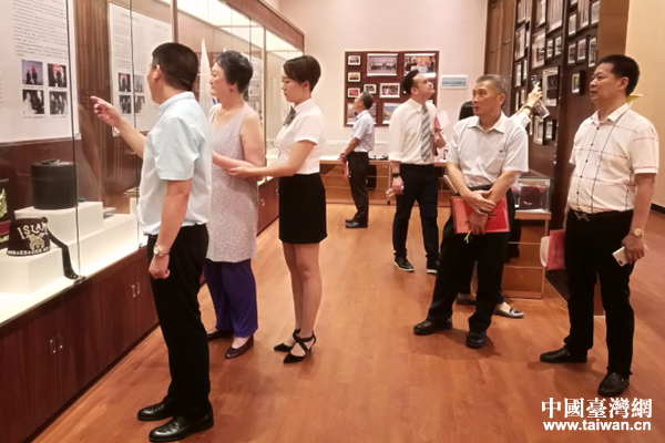 臺胞徐燕女士(左中)與兒子霍偉強(右三)在廣州市臺協(xié)會長王治中(右二)、花都區(qū)臺協(xié)會長童祖耀(右一)陪同下參觀校史館和其父徐亨事跡陳列室。(圖片來源:廣州市花都區(qū)臺辦)