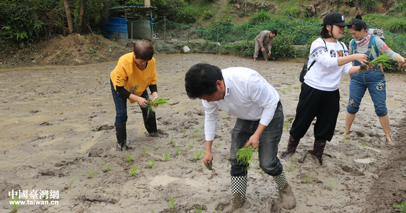 臺(tái)商們在山頂?shù)幕实厶镏胁逑麓渚G的秧苗。(圖片來源:中山市臺(tái)灣事務(wù)局)